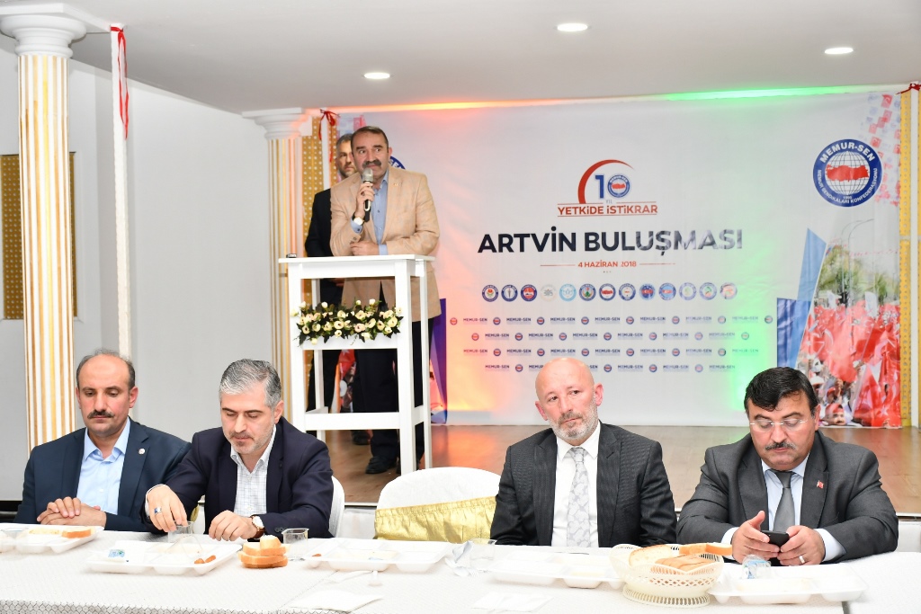 Artvin Belediye Başkanı Mehmet Kocatepe ise selamlama konuşmasında Memur-Sen camiasının Artvin’de böylesine büyük bir kalabalık ile bir iftar programı düzenlemesinin çok değerli ve kıymetli olduğunu belirterek Türkiye’nin en büyük konfederasyonu olan Memur-Sen’in bu ülkeye sağladığı kazanımlarında çok büyük olduğuna vurgu yaptı. Artvin’de 4 yılda çok büyük ve önemli hizmetler gerçekleştirdiklerini hatırlatan Başkan Kocatepe, bu hizmet ve yatırımların artarak devam etmesi için AK Parti’nin Meclis’te güçlü olması ve Cumhurbaşkanı Erdoğan’ın da çok büyük bir oy farkıyla yeniden Cumhurun Başkanı olması gerektiğini ifade etti. Başkan Kocatepe sözlerini; “ Ben Artvin’de başkan olsam ne olur olmasam ne olur? Eğer Cumhurbaşkanımız güçlü bir oy ile yeniden seçilemez ise benim başkanlığım neye yarar ki. Eğer, meclise iki arkadaşımızı gönderemez isek o zaman benim başkanlığımın ne kıymeti kalır ki? Bakınız ülkemiz 16 yılda nereden nereye geldi. Bizlerin 16 yılda ki kazanımlarını kaybetmemiz için 24 Haziran seçimleri çok ama çok önemlidir. Ülkemizin 16 yıl öncesine yeniden geriye dönmemesi adına bizlerin durup dinlenmeden çalışması ve koşturması gerekmektedir. Bir oya bir oy, 4 oya 8 oy katmamız gerekiyor ki Türkiye bir daha asla geriye dönmesin. Bu duygularla sizleri selamlarken böylesine büyük bir katılım ile iftar programını bir şölene çevirdiğiniz için teşekkür ediyorum. İnşallah 24 Haziran’da şölen olacaktır” diye konuştu.