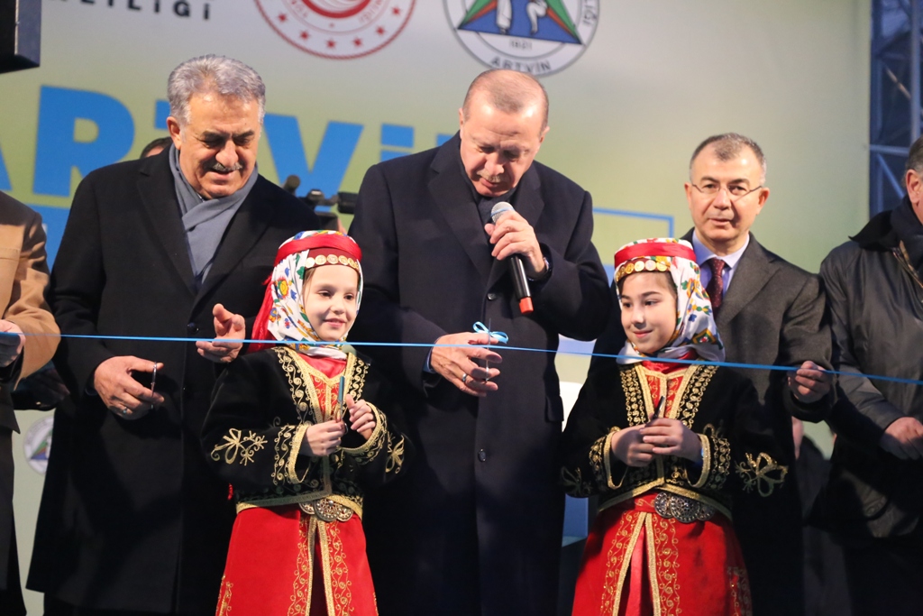 Cumhurbaşkanı Erdoğan, toplu açılış töreni öncesi yaptığı konuşmasına bir şiir ile başladı. Erdoğan okuduğu şiirde, “ Topla gönül şu Artvin'in gülünden. Şavşat'tan, Borçka'dan Yusufeli'nden. Hopa'dan anlarsın deniz dilinden. Bak Çoruh namını yayıp geliyor. Söz geçirmiş topraklara taşlara. Dönmüş kanat açıp uçan kuşlara. Gökyüzünden bakıp Ardanuçlulara, döne döne yola uymuş geliyor. Artvin Halife Harun Reşit'in, Sultan Alpaslan'ın, Fatih'in, Yavuz'un, Kazım Karabekir'in yadigarı Artvin. İskitler'den hazarlara kadar, tarihte tüm önemli medeniyetlerin gözde şehri Artvin. Tabiatı güzel, havası güzel, insanı bir başka güzel Artvin. Bin bir çeşidin, bin bir lezzetin güzelliği Artvin. Cennet bahçelerinin timsali Artvin. Bitkisiyle yeşilin başkenti Artvin. Kardeşliğin, birliğin, dayanışmanın şehri Artvin. Müziğiyle, folkloru ile kültürümüzü besleyen Artvin. Turizm'i ile barajları ve madenleri ile ülkemizin iftiharı Artvin sizleri bir kez daha gönülden selamlıyorum. Arhavi'yi, Hopa'yı, Kemalpaşa'yı, Borçka'yı, Ardanuç'u, Murgul'u, Şavşat'ı, Yusufeli'ni selamlıyorum” diyerek başladı.