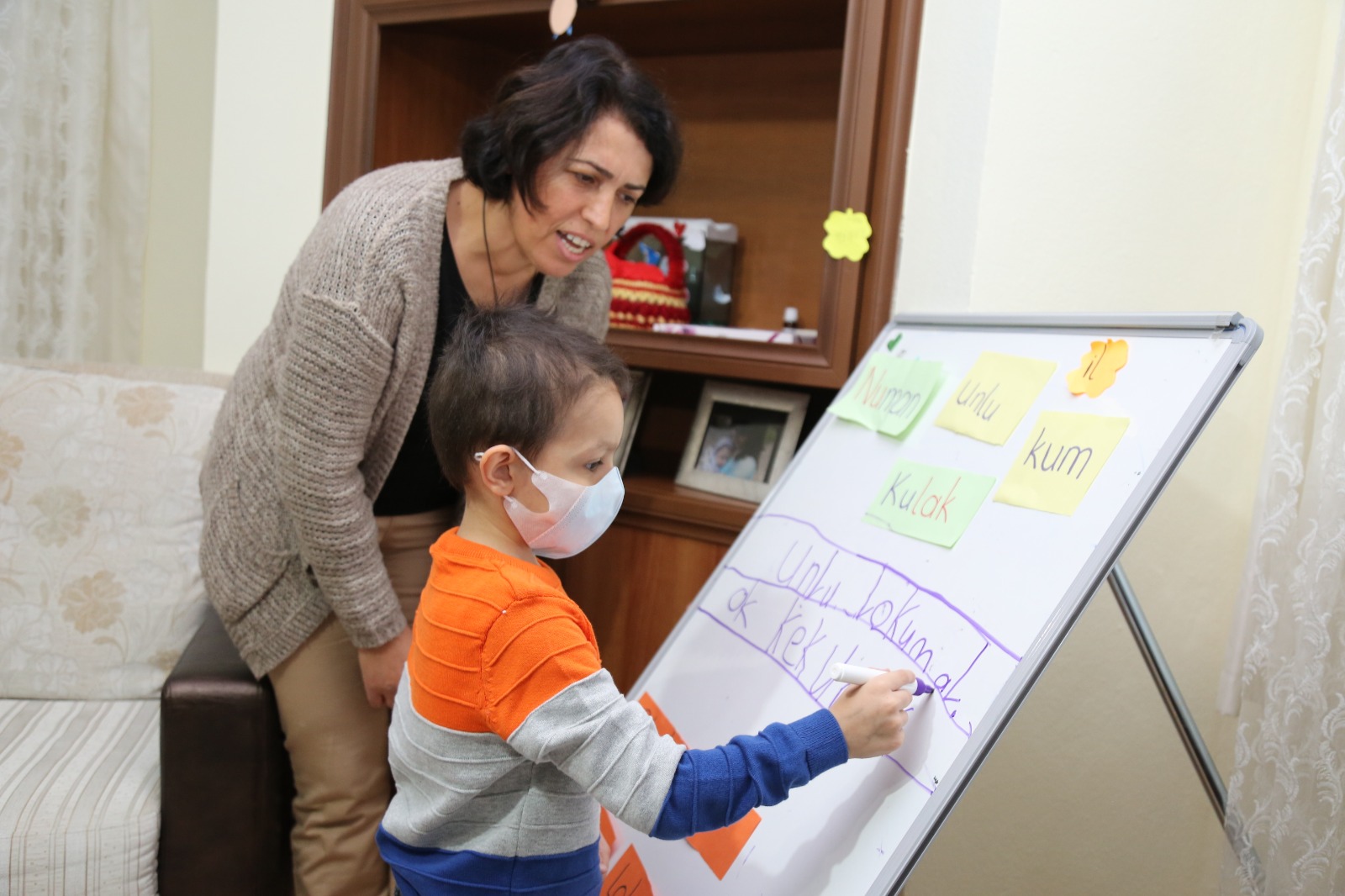 Evde eğitim hizmetinden faydalanan lösemi hastası Berat Çağan Atan ile zihinsel engelli Ergün Kılıç, sınıf haline getirilen odalarında evlerine gelen öğretmenleriyle ders işleyerek eğitim hayatlarının sürdürüyor.