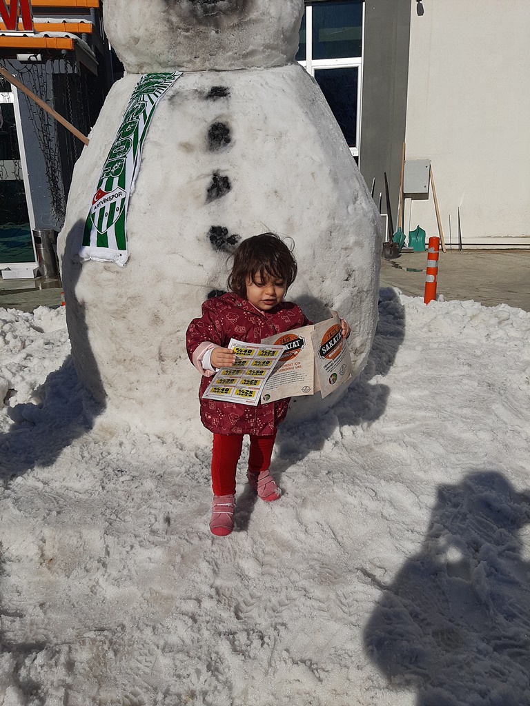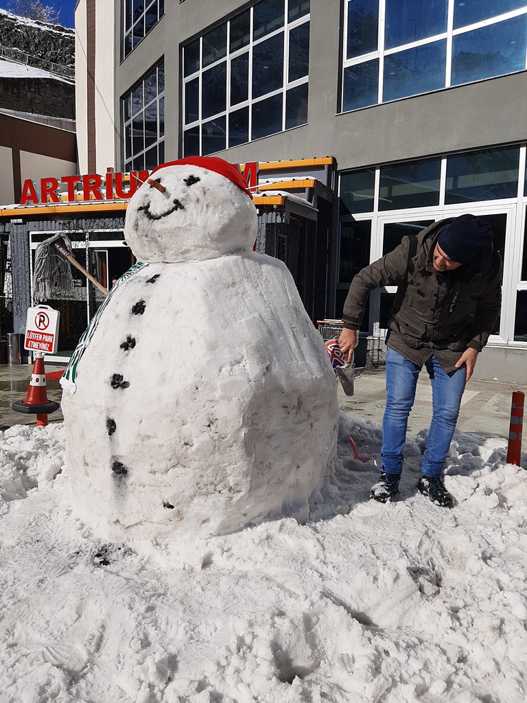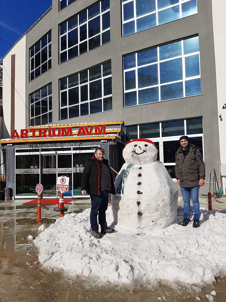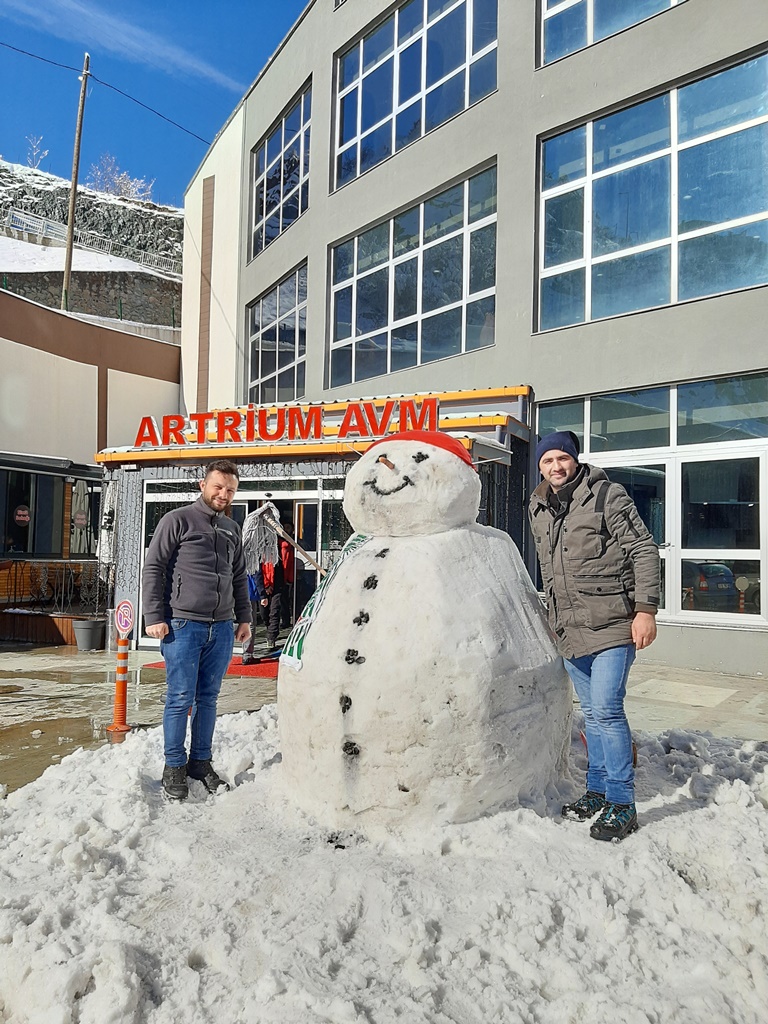 Artvin Merkez’de Artrium Alışveriş Merkezi’de karı mutluluğa çevirmeye çalışan işyerlerinden biri oldu. Artrium AVM’nin çevresine yağan kar birikintileri temizlendikten sonra bir araya getirilerek dev bir kardan adama çevrildi. Artrium AVM’ye gelen vatandaşlar ve özellikle de çocuklar kardan adam sürprizi ile karşılaşınca mutluluk yaşarlarken, dev kardan adamla fotoğraf çektirmeyi de ihmal etmediler.
