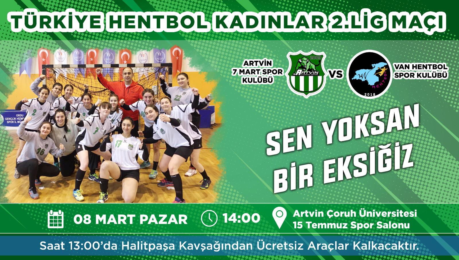Türkiye Hentbol Kadınlar 2. Lig maç kapsamında Artvin 7 Mart Spor Kulübü ile Van Hentbol Spor Kulübü karşı karşıya gelecek. 8 Mart Pazar Günü Artvin Çoruh Üniversitesi 15 Temmuz Spor Salonu’nda oynanacak maç saat 14:00’ te başlayacak.