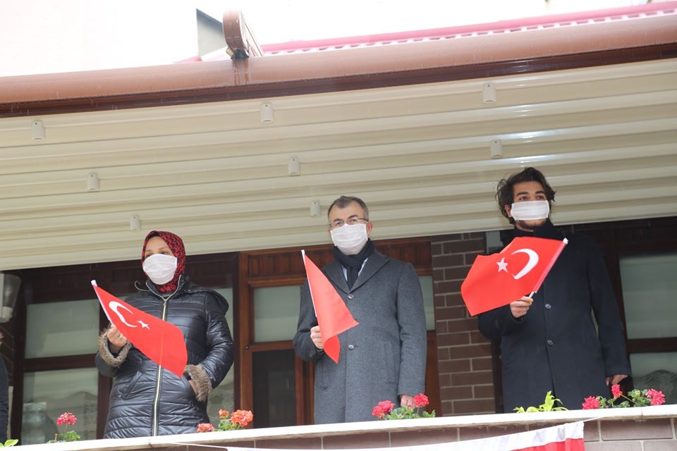 Vali Doruk ve ailesi ellerindeki bayraklarını sallayarak belediye hoparlöründen çalan şarkı ve şiirlere eşlik etti.