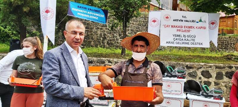 Artvin Valiliği ve ilgili kurumlarda yapılan bu faydalı çalışmanın teşvik edilmesi ve kolaylaştırılması amacıyla çalışanlara elektrikli çay hasat makinası, çay makası, tulum, çizme, yağmurluk gibi alet-ekipman ve malzeme desteğinde bulundu.