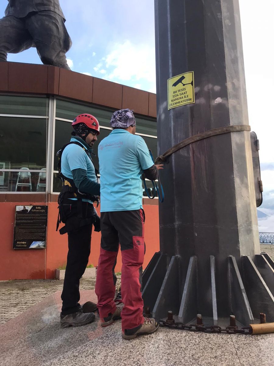 Vinç yardımı ile değişilemeyen bayrak direğinin çelik halatı, şehrimizde ki iş insanlarından Ömer Yılmaz’ın destekleriyle, Ankara firması olan Dönüşüm Akademiden gelen profesyonel dağcı Mustafa Coşkun ve Özkan Özgür’ün yaklaşık 5 saatlik çalışmaları neticesinde 60 metre yüksekliğinde ki çelik halat değiştirildi.