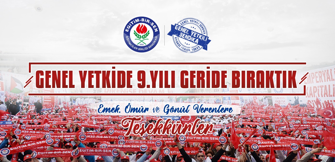 “Eğitim-Bir-Sen, örgütlü olmanın hak ve adalet yolunda diri ve güçlü olmak anlamına geldiğine inanarak çıktığı yolda, eğitim çalışanlarının haklarının korunması ve geliştirilmesi mücadelesinde genel yetkide 9. yılı geride bırakmış bulunmaktadır”dedi.