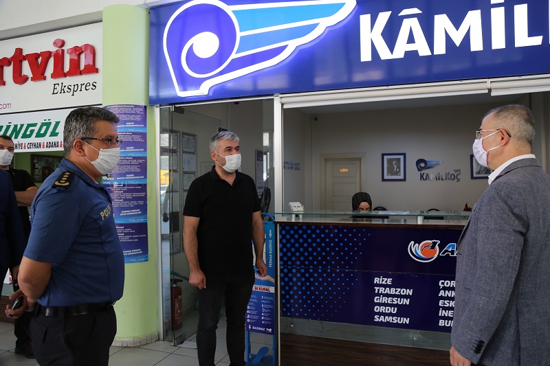 Artvin Valisi Yılmaz Doruk, Artvin otogarda yeni tip koronavirüs (Covid-19) ile mücadele kapsamında otogarda ve burada bulanan yazıhanelerde alınan Covid-19 tedbirlerini inceledi.