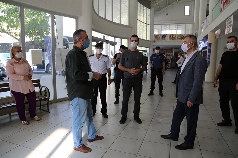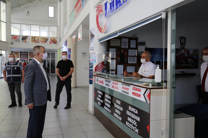 Otogarda ki yazıhaneleri gezerek buralarda uygulanan Covid-19 tedbirlerine ilişkin gözlemlerde bulunup iş yeri sahiplerinden bilgi alan Vali Doruk, Covid-19’la mücadelenin üç temel kuralı olan temizlik, maske ve fiziki mesafe kurallarına istisnasız uyulması konusunda uyarılarda bulundu.