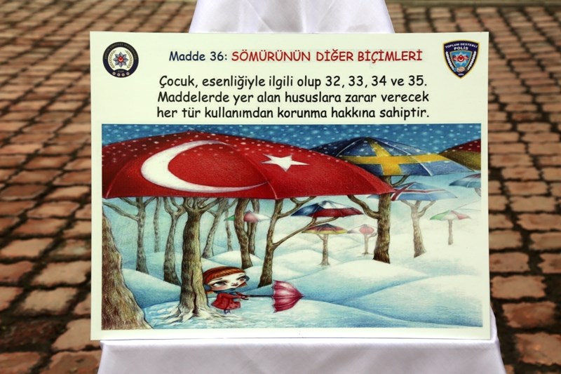 İl Emniyet Müdürlüğü Toplum Destekli Polislik Şube Müdürlüğünce Milli İrade Meydanı’nda açılan resim sergisinde çocuk hakları konusunda farkındalık oluşturmak amacıyla çocuk hakları sözleşmesindeki ana maddelerin yazılı olduğu resimlerle süslenmiş tablolar sergilendi.
