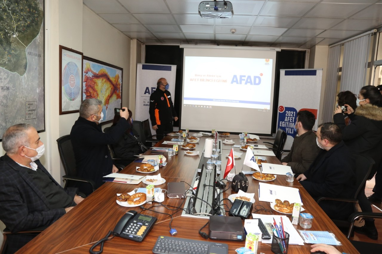 AFAD Müdürlüğü toplantı salonunda gerçekleştirilen eğitimde İl Müdürü Mehmet Salih Avcı, afetlerle ilgili genel bilgi vererek, deprem öncesi, deprem sırasında ve sonrasında yapılacak doğru davranışları anlattı.