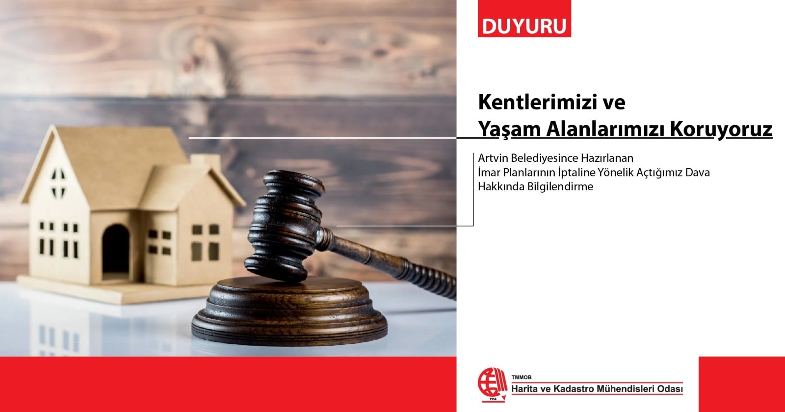 “TMMOB Harita ve Kadastro Mühendisleri Odası ile birlikte TMMOB Artvin İl Koordinasyon Kurulunun öncülüğünde Yeşil Artvin Derneği, Artvin Barosu ve Artvin`de yaşayan pek çok vatandaşın da davacı olduğu ve Artvin Belediye Meclisinin 05.12.2018 tarihinde yapılan toplantısında ihale yapılarak hazırlanmış olan Artvin Merkez 1/5000 Ölçekli İlave ve Revizyon Nazım İmar Planı ve 1/1000 Ölçekli Uygulama İmar Planının uygunluğuna ilişkin verdiği kararların iptali istemiyle Artvin Belediye Başkanlığına karşı açtığımız davada; mahkeme tarafından nihai karar verildi.