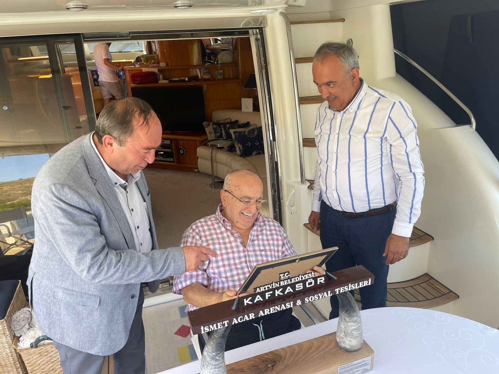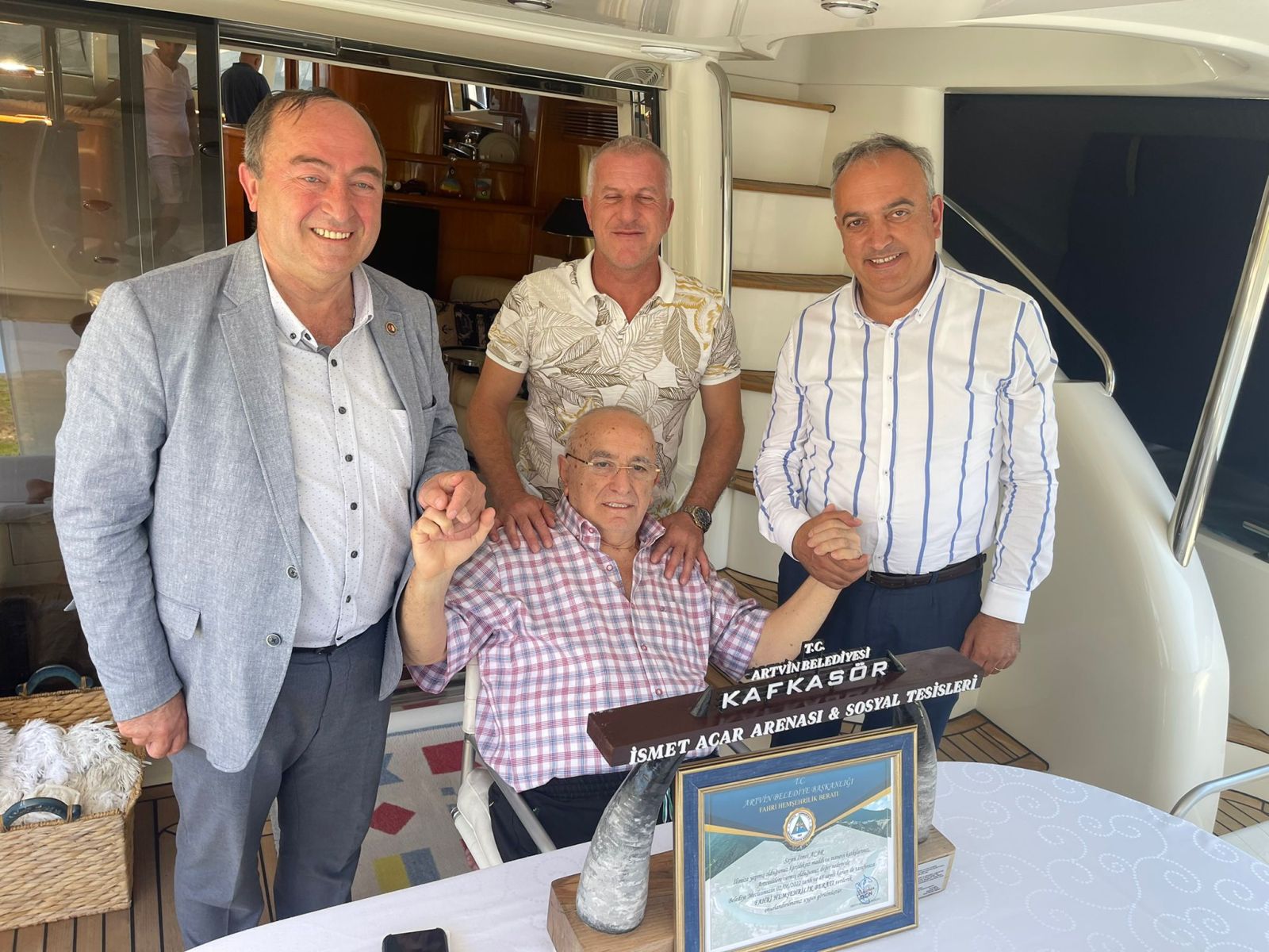 Kafkasör Yaylasında 82.835 m² Arena alanın Artvinliler adına Artvin Belediye Başkanlığının satın alması için vermiş olduğu karşılıksız nakit bağış ve Artvin il geneline yapmış olduğu karşılıksız yardımlar için Hayırsever İş İnsanı Sn. İsmet Acar’a, Artvin Belediye Meclisinin 02/06/2022 tarih ve 48 sayılı kararı ile verilen Fahri Hemşerilik Beratını; Başkan Elçin, İsmet Acar’ı ziyaret ederek ‘Fahri Hemşerilik Beratı’ ve Kafkasör Yaylasındaki alanın girişine konuşlandırılan boğa boynuzu şeklindeki tagın 1/20 ölçekli minyatürünü İsmet Acar’a takdim etti.