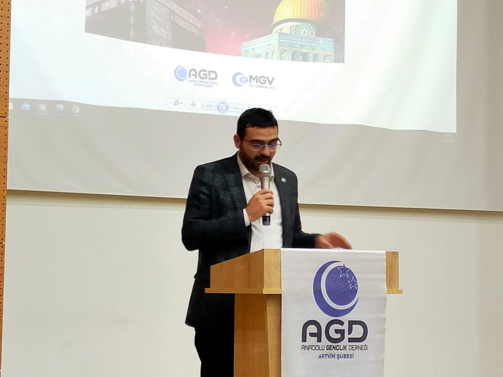 AGD Artvin Şube Başkanı Mahmut Sami Koçak, yaptığı konuşmada, İsrail-Filistin işgaline değinerek, “Bugün yeryüzünde Siyonist ve Emperyalist güçler İslam ülkelerinde ve mazlum coğrafyalarda zulümlerine devam etmektedir. Zulmün ve terörün tüm yüzlerini gördüğümüz zamanlardan geçmekteyiz. İslam âlemi ve mazlum coğrafyalar her gün ağır bedeller ödemeye ve acılar çekmeye devam ediyor. İlk kıblegahımız Mescid-i Aksa, kutsal toprağımız Kudüs, Filistin; Gazze uluslararası camiada meşruiyeti bulunan ve devlet olarak tanınan, fakat gerçekte bir terör örgütü olan İsrail’in saldırılarıyla işgal ve mezalim altındadır.” dedi.