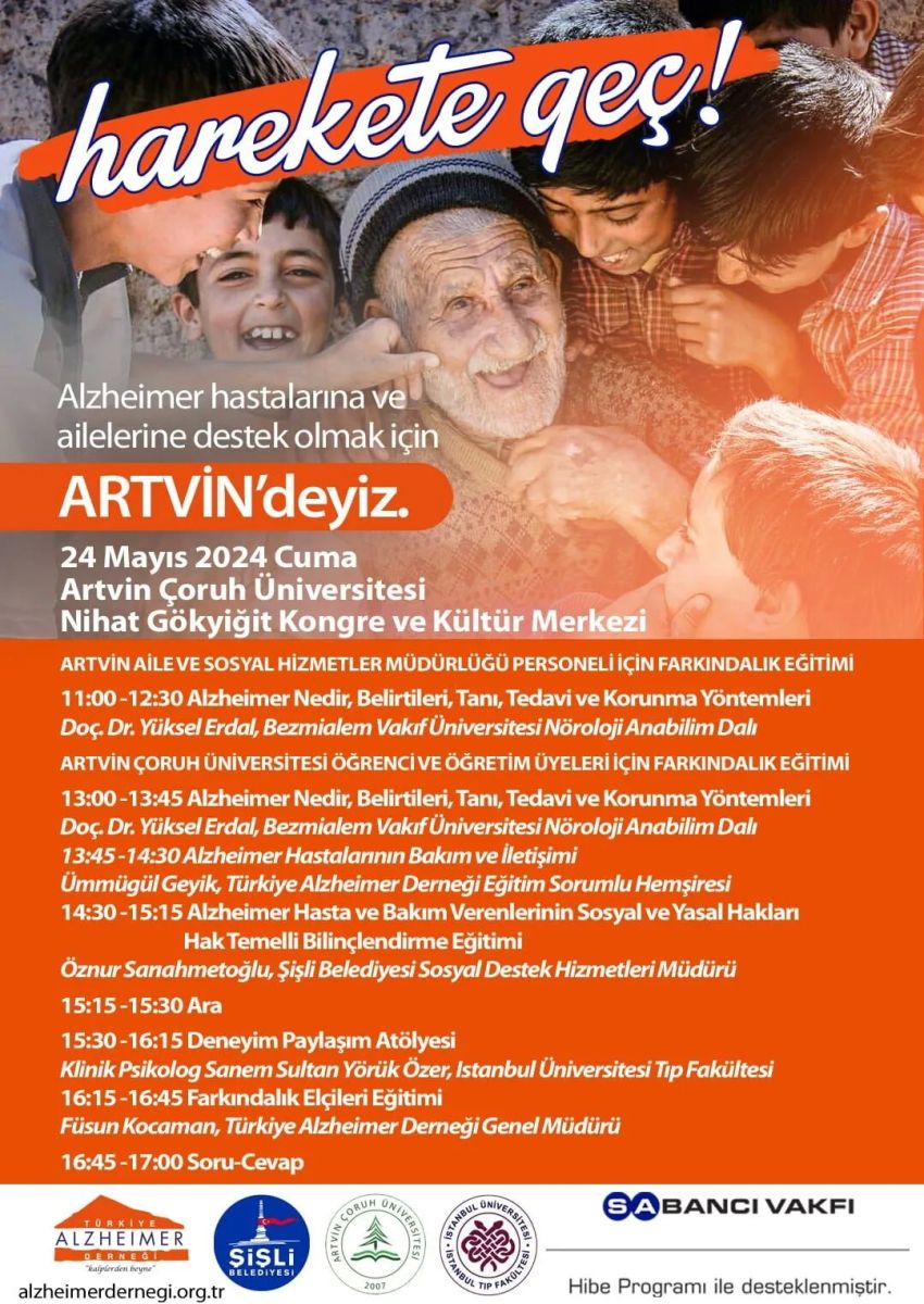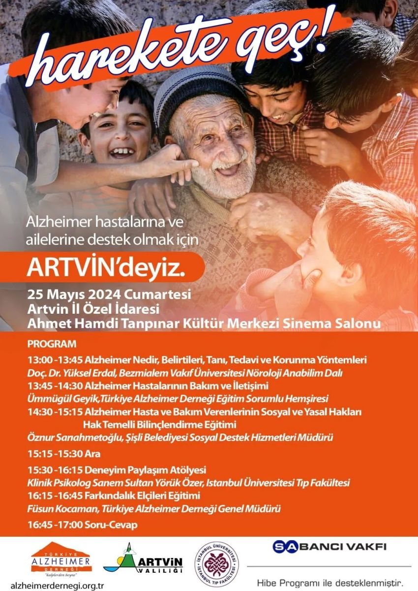 25 Mayıs 2024 Cumartesi günü programı; Artvin İl Özel İdaresi Ahmet Hamdi Tanpınar Kültür Merkezi Sinema Salonunda 13:00-13:45 Alzheimer Nedir, Belirtileri, Tanı, Tedavi ve Korunma Yöntemleri Doç. Dr. Yüksel Erdal, Bezmialem Vakıf Üniversitesi Nöroloji Anabilim Dalı  13:45-14:30 Alzheimer Hastalarının Bakım ve İletişimi Ümmügül Geyik, Türkiye Alzheimer Derneği Eğitim Sorumlu Hemşiresi  14:30-15:15 Alzheimer Hasta ve Bakım Verenlerinin Sosyal ve Yasal Hakları Hak Temelli Bilinçlendirme Eğitimi Öznur Sarıahmetoğlu, Şişli Belediyesi Sosyal Destek Hizmetleri Müdürü  15:15-15:30 Beden  15:30-16:15 Deneyim Paylaşım Atölyesi Klinik Psikolog Sanem Sultan Yörük Özer, Istanbul Üniversitesi Tıp Fakültesi 16:15-16:45 Farkındalık Elçileri Eğitimi Füsun Kocaman, Türkiye Alzheimer Derneği Genel Müdürü  16:45-17:00 Soru-Cevap Eğitimlerin içerikleri doğrultusunda Merkez tarafından seçilen hekim, hemşire, psikolog ve sosyal hizmet uzmanı eğitmenler, Istanbul Merkezde ön “Eğitmen Eğitimi” aldıktan ve Pilot Eğitim gerçekleştirdikten sonra, bu illere interaktif ve yarı kurgulanmış eğitimleri gerçekleştirmek ve gönüllü Farkındalık Elçileri yetiştirmek üzere gönderilidiği belirtildi.  Eğitimler sırasında katılımcıların bilgi ve beceri kazanma kazançları anket ve röportajlarla ölçümlenmekte ve raporlandığı karılımcılara daha sonra başvurmaları ve çevrelerini de yararlandırmaları için Türkiye Alzheimer Derneği tarafından proje kapsamında hazırlanan kitapçık verileceği aktarıldı. Katılımcılar ile yapılan bu yakın temas çalışmalarda, kendileri Dernek şubesi kurma konusunda yüreklendirilmekte, böylelikle ilişkilerin kalıcı hale getirilmesinin yolları araştırılmaktadır. Eğitim sona erdikten sonra da bu program kapsamında eğitim alan ve bölgedeki bilinçlendirmeyi artırmak üzere gönüllü çalışmalar yürütecek olan Farkındalık Elçileri ile düzenli iletişim sürdürülecek ve onların düzenledikleri Farkındalık Toplantılarından geribildirimleri alınacak; yeni tedavi yöntemleri, yönetmelik, yasa, mevzuat gibi konularda Farkındalık Elçilerinin bilgileri aktarıldığı kaydedildi.