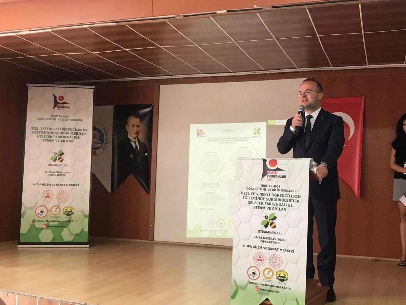 Açılış programında konuşma yapan Hopa Kaymakamı Abdullah Arslantürk, projede katkısı olan öğretmen ve öğrencileri tebrik ederek arıların önemli bir noktada olduğuna değindi.