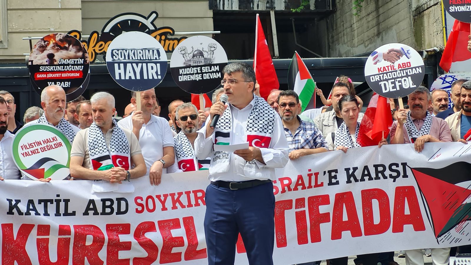 Protesto sırasında “Siyonizme karşı omuz omuza”, “Katil İsrail Filistin’den defol”, “Susma haykır soykırıma hayır”, “Filistin halkı yalnız değildir”, “Şehitler ölmez direniş bitmez” gibi sloganlar atıldı.