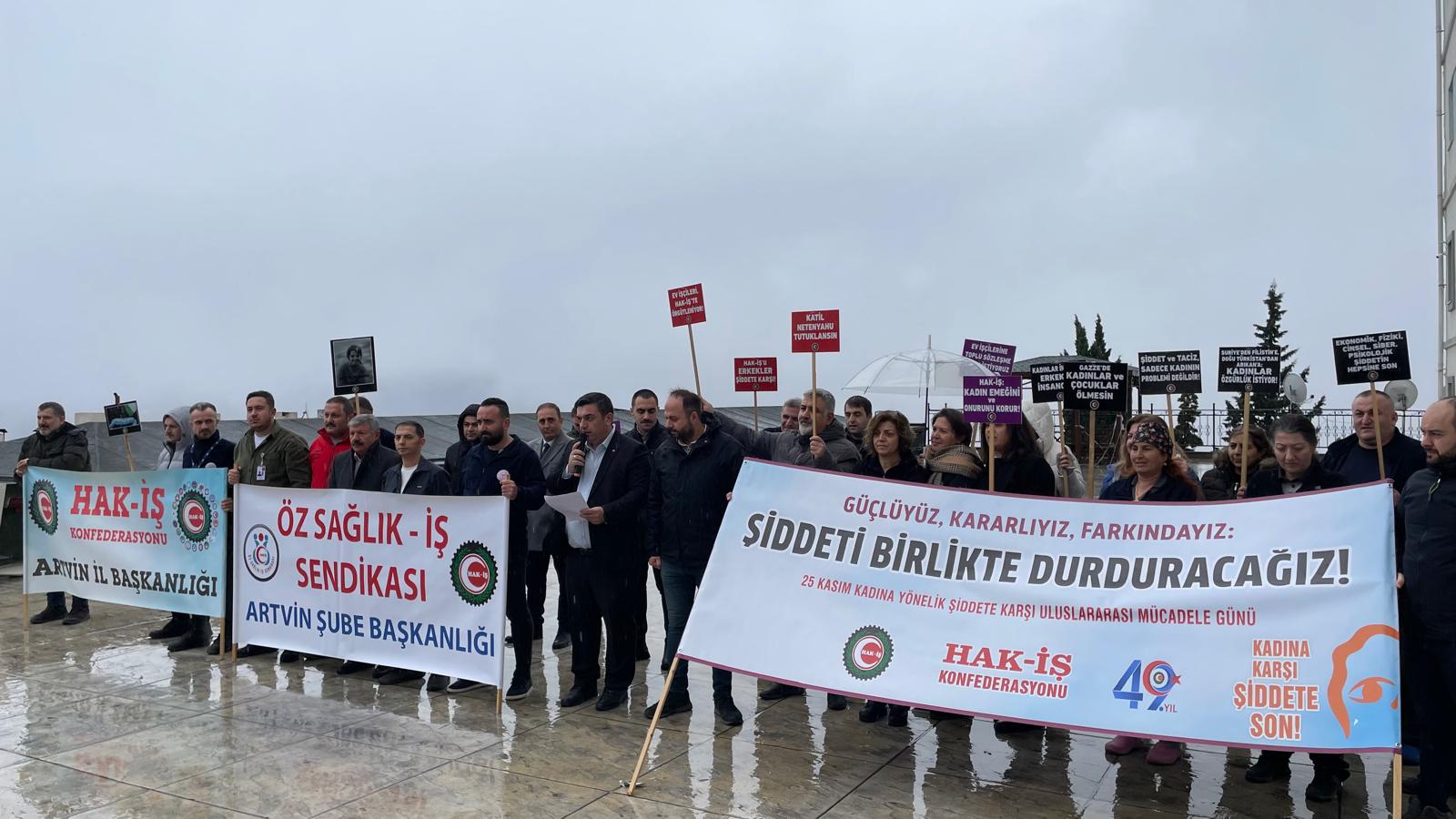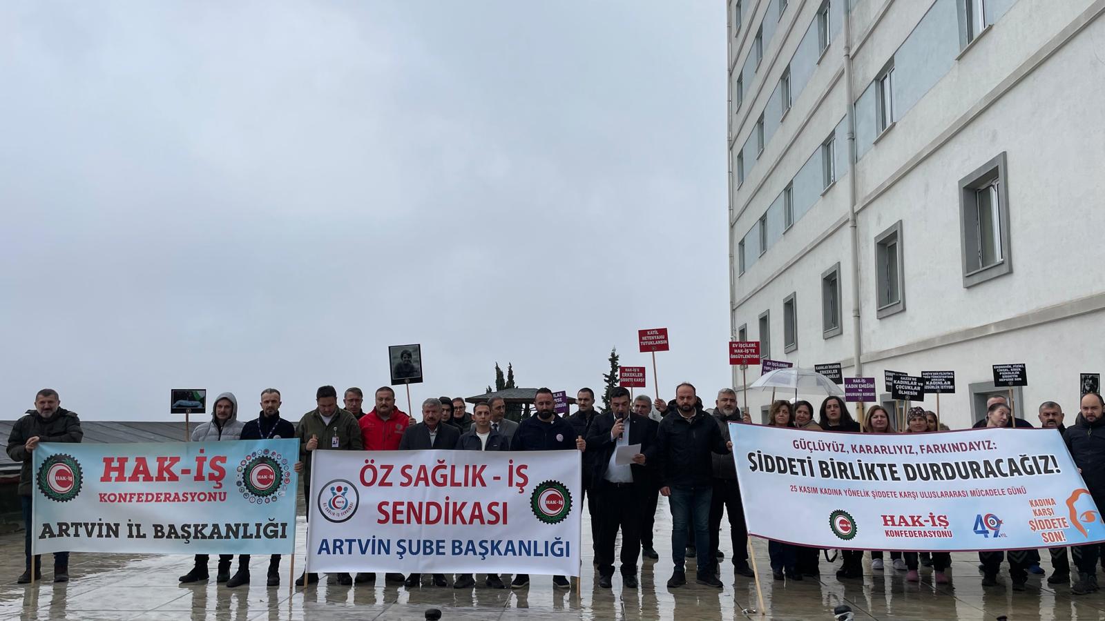 Artvin Devlet Hastanesi önünde toplanan Öz Sağlık-İş Sendikası, HAK-İŞ Konfederasyonu çatısı altında 25 Kasım Kadına Yönelik Şiddete Karşı Uluslararası Mücadele Günü dolayısıyla bir basın açıklaması gerçekleştirdi. Saat 10.00’da başlayan etkinlikte, Sendika temsilcisi Bülent Kaşıkçı, şiddetin her türüne karşı net bir duruş sergileyerek kadın cinayetlerinden istismara, eşitsizlikten yoksulluğa kadar pek çok toplumsal soruna dikkat çekti.