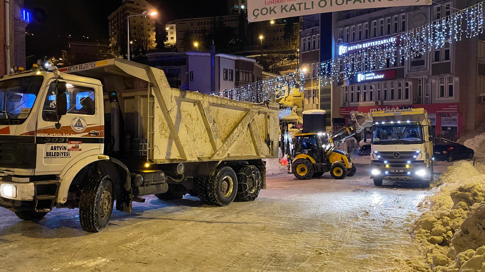 Artvin’de etkili olan yoğun kar yağışının ardından belediye ekipleri, yolları açık tutmak ve şehirde ulaşımı aksatmamak için aralıksız çalışıyor. Biriken karlar kamyonlara yüklenerek şehir dışına taşınıyor.