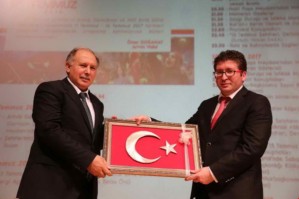 Artvin Valisi Ömer Doğanay konuşmaların ardından Kara’ya Türk Bayrağı işlemeli tablo hediye etti.