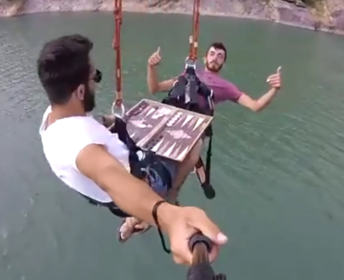 Borçka Baraj gölü kenarında kurulu bulunan zipline hattı ilginç görüntülere sahne oldu. Canları sıkılan Artvinli gençler Kadir Çakıcı ve Ertuğrul Ediz, her zaman karada oynadıkları tavlayı bu kez Zipline Hattı'nda oynamak istedi. Zipline'ye binen gençler ortalarına aldıkları tavlayı 385 metre gidiş, 375 metre geliş mesafesi boyunca oynayarak keyif yaşadılar. 15 metreden başlayarak yer yer 20 metre yüksekliğe ulaşan, çift tel sistemli zipline aynı zamanda bölgeye gelen turistlerinde ilgi odağı. Artvin'e gelen herkesin dikkatini çeken zipline hattını tavla oynayarak değerlendiren gençler, telefonlarıyla bu görüntüyü kaydederek sosyal medyada paylaştı. Gençlerin bu paylaşımı sosyal medyada büyük ilgi gördü.