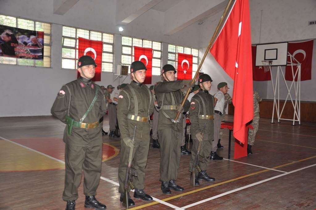 Saygı Duruşu ve İstiklal Marşı’nın okunmasıyla başlayan tören askerlerin Türk bayrağı ve silahların bulunduğu masaya ellerini koyarak toplu halde yemin etmesiyle devam etti.