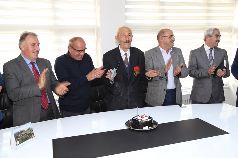Aşık İbrahim Kara’nın Şavşat Nüfus Müdürlüğü’ne geldiğini ve 94 yaşına girdiğini öğrenen Şavşat Belediye Başkanı Ahmet Sinan Öztürk, aşık İbrahim Kara’ya doğum günü sürprizi yaptı.