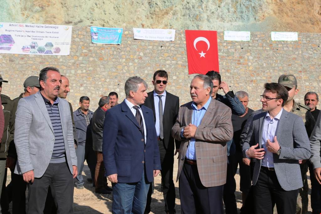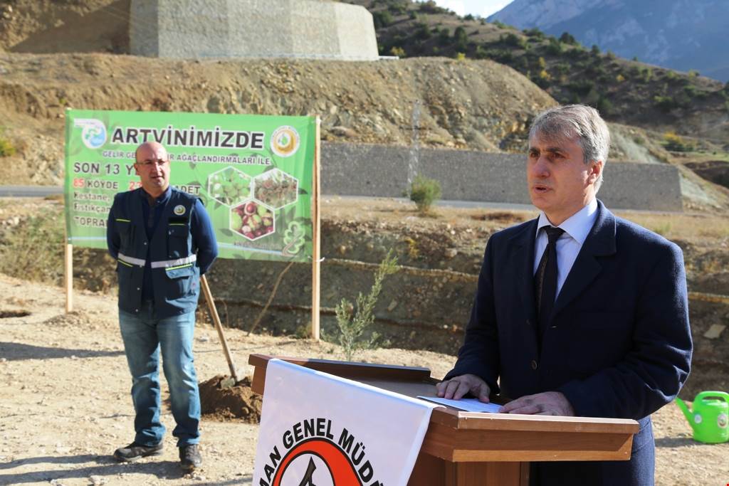 " Ülkemizde gerçekleşen değişim ve gelişim çerçevesinde Orman ve Su İşleri Bakanlığı da ormanların yararlanmasında önemli değişiklik yaparak ormanın imkanlarını vatandaşın orman köylüsünün hizmetine açmıştır. Bu hizmetlerin biri de gelişim projelerinde yer alan Sayın Bakanımız Prof. Dr. Veysel Eroğlu’nun titizlikle takip ettiği Orman Genel Müdürlüğü tarafından yürütülen 5 bin köye beş bin orman gelir getirici ağaçlandırma çalışmalarıdır. Artvin ilinde geçmiş yıllarda yapılan çalışmaların yanında bu yılda 40 köyde 1000 hektar alanda gelir getirici tür ağaçlandırması yapılacaktır. Bugün de gelir getirici tür ağaçlandırma faaliyetlerimizde ağırlıklı olarak Artvin ilinde yetişen orijin tür olan butko zeytin fidanı dikimi gerçekleştirilecektir Müdürlüğümüz tarafından üretilen 15 bin zeytin fidanından 2 bin 500 adedini bu yıl, 3 bin 500 adedini de 2018 yılında bu alanlara dikmiş olacağız. Ayrıca ceviz, badem, hurma, nar ve kızılcık gibi türlerin de dikimi gerçekleştirileceğiz. Toplamda 14 bin 600 adet fidan toprakla buluşturulmuş olacağız. Karayolu boyunca baraj kenarında yapmış olduğumuz bu ağaçlandırma çalışması orman köylüsüne gelir getirecek olmasının yanında yol peyzajına, baraj çevresinde yapılmış olması nedeniyle erozyon kontrolüne de katkı sağlayacaktır. Dikimini gerçekleştireceğimiz bu fidanların 3 yıl bakımı idaremiz tarafından yapılarak, orman köylüsüne gelirinden faydalanmak üzere sertifika ile verilerek teslim edilecektir. Yapmış olduğumuz çalışmalarda bize her türlü desteği veren Sayın Valimize teşekkürlerimizi arz ediyoruz, diktiğimiz fidanların bereketli ürün vermesini diliyor saygılar sunuyorum” diye konuştu.