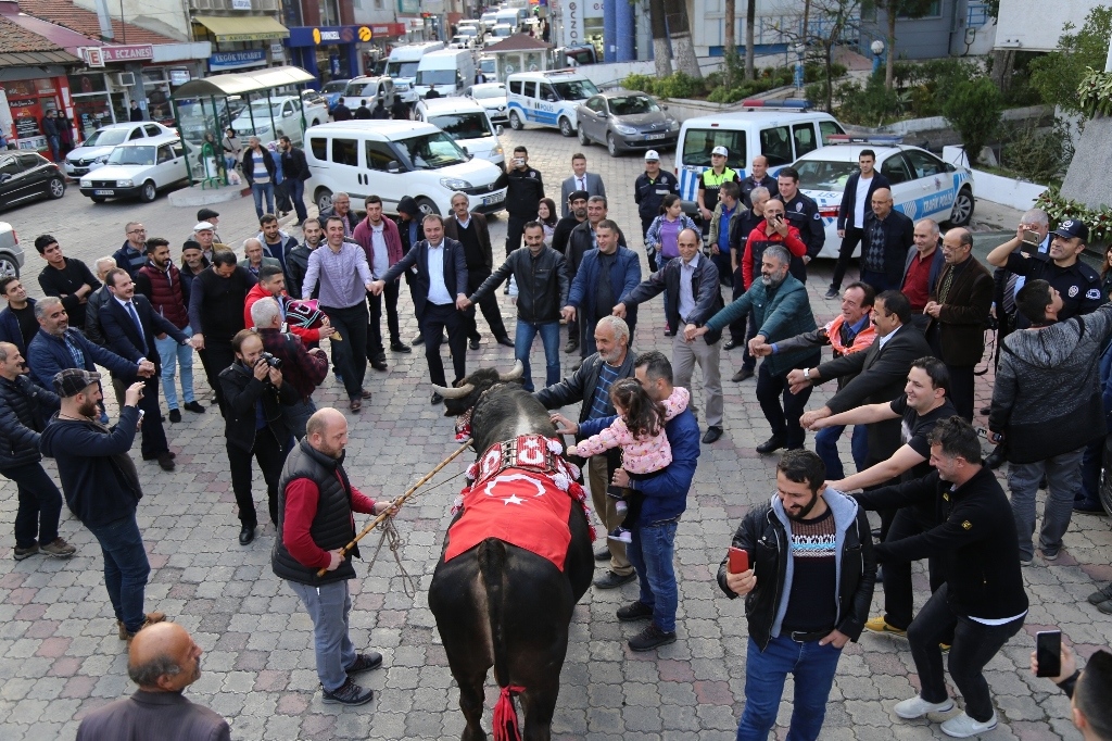 Halitpaşa Meydanı’nda toplanan kalabalık, birinci olan boğayla birlikte akordeon ve tulum eşliğinde İnönü Caddesi üzerinden Valilik binasına doğru kortej yürüyüşü gerçekleştirdi.