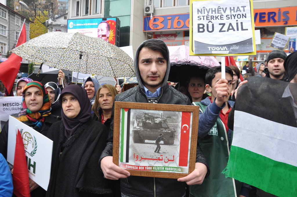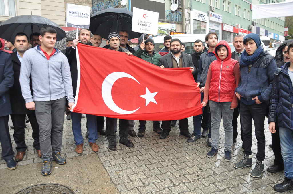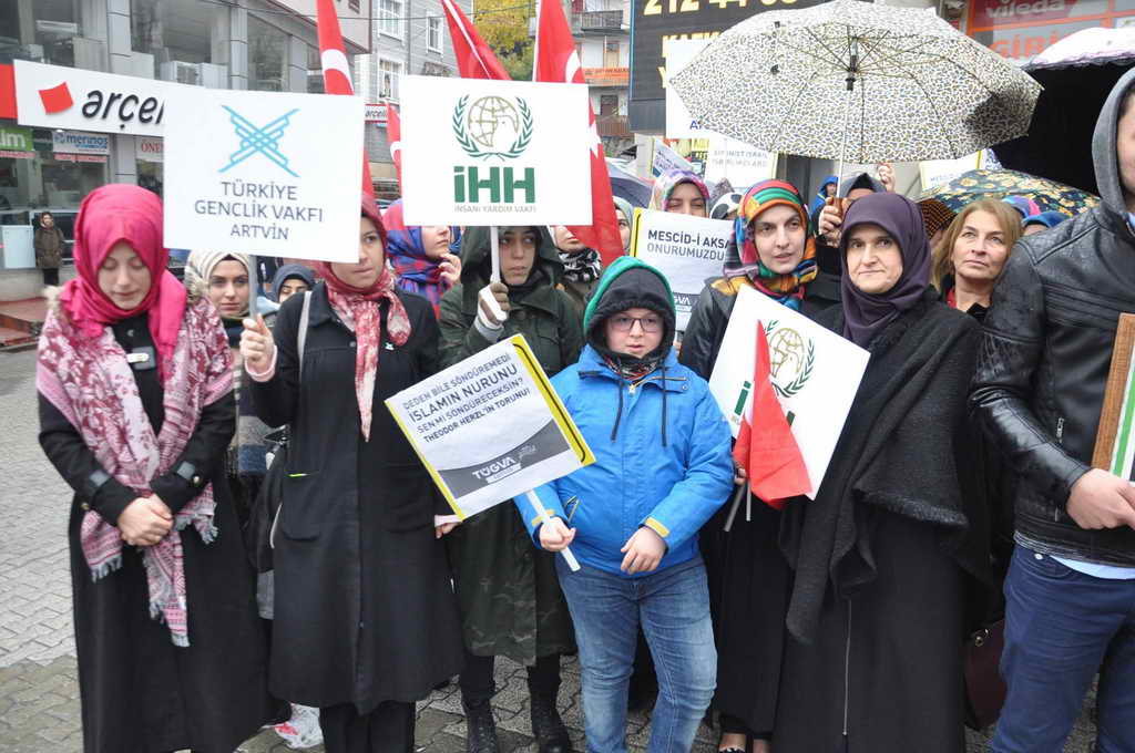 Türkiye Gençlik Vakfı Artvin İl Temsilciliğinin (TÜGVA) organizasyonu ile Artvin Sivil Toplum Platformu tarafından Halitpaşa Meydanı’nda düzenlenen basın açıklamasında Siyonizm karşıtı sloganlar atılarak Kudüs’ün İsrail’in başkenti olması söylemleri protesto edildi.