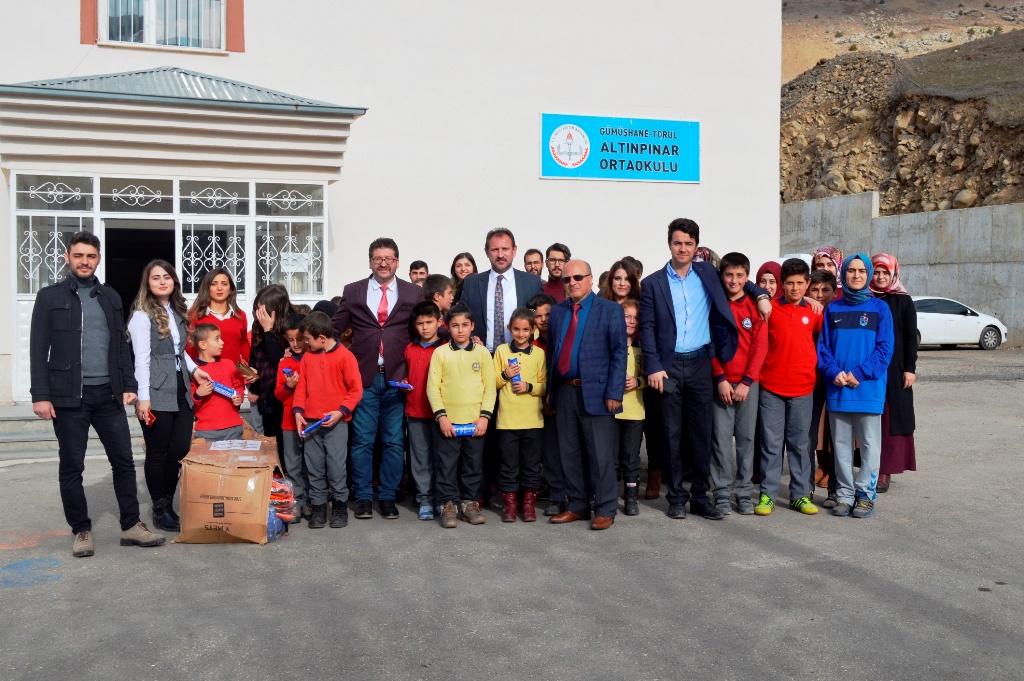 Yrd. Doç. Dr. Cihan Kara ve AÇÜ Sınıf Öğretmenliği öğrencileri Torul İlçe Milli Eğitim Müdürlüğünü de ziyaret ederek iki okula yardımda bulundular. Artvin Valisi Ömer Doğanay’ın Gümüşhane Altınpınar Ortaokuluna gönderdiği hediyeleri ve AÇÜ öğrencilerinin kendi imkânlarıyla temin ettikleri hediyeleri okula teslim ettiler. Ayrıca Torul ilçesinde şehidin adının verildiği Şehit Necmettin Yılmaz Anadolu İmam Hatip Lisesini de ziyaret ederek ihtiyaç sahibi öğrenciler için hazırladıkları hediyeleri sundular.