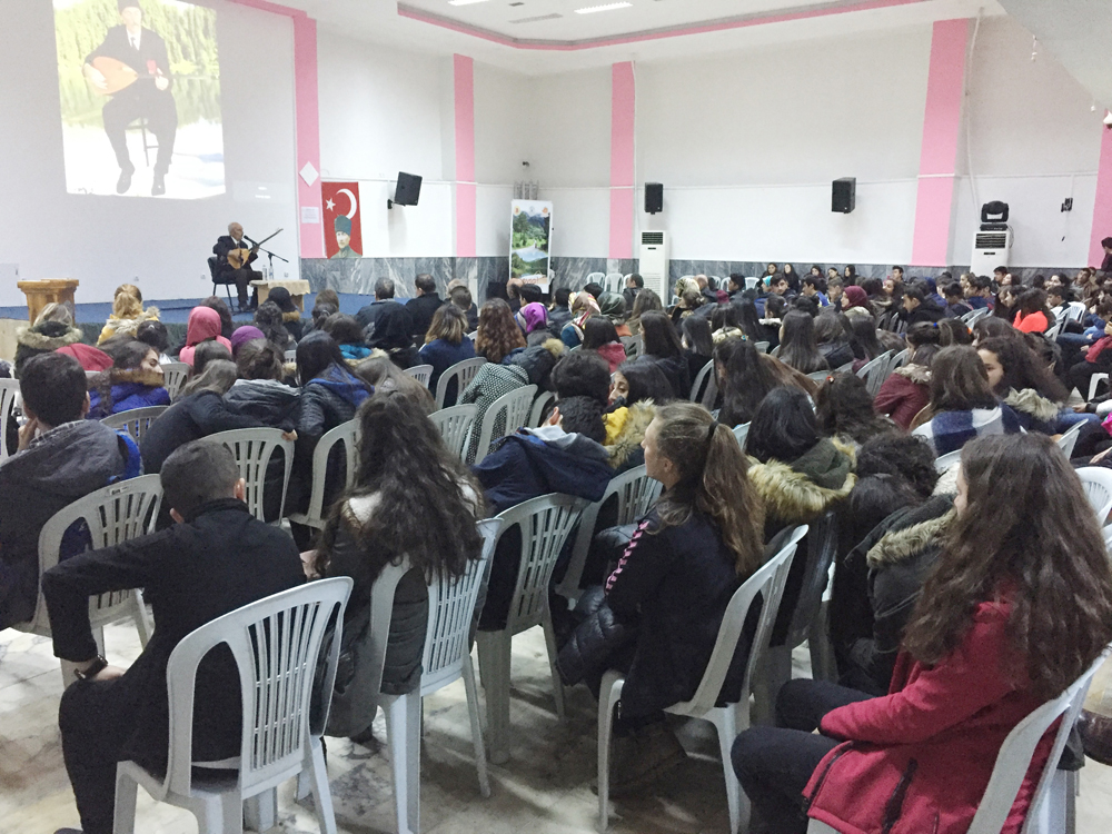 Etkinliği hazırlayan okulun Tarih Öğretmeni Deniz Tireli’ de yapmış olduğu konuşmada; “Âşıklık geleneğinin kökeni konusunda çeşitli görüşler bulunmakla birlikte genel kabul, âşıklığın ozan-baksı edebiyatı olarak adlandırılan Türk destan anlatım geleneğine dayandığı ve Türklerin İslamiyet’i kabul etmesinden sonra ortaya çıkan tasavvufi düşünce ile Selçuklu ve Osmanlı yaşamı biçimi ve kabullerinin bu geleneği şekillendirdiği yönündedir.