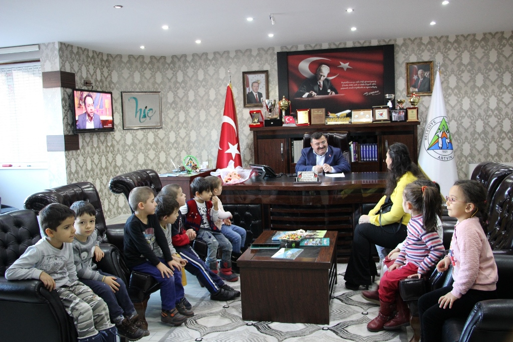 Çoruh İlkokulu Yıldızlar anasınıfı öğrencileri meslek grupları tanıma ve görevlerini öğrenme kapsamında Artvin Belediye Başkanı Mehmet Kocatepe’yi makamında ziyaret etti.