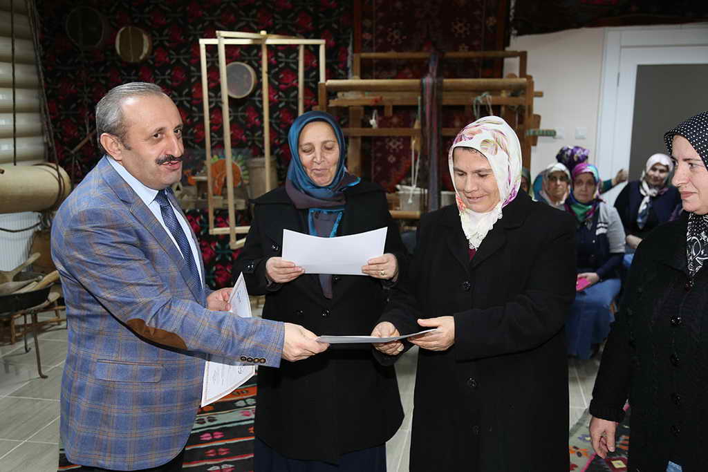 Şavşat Belediyesi ve İŞKUR İl Müdürlüğü iş birliği ile Ülkü Ulusoy Kadın Eğitim Yaşam Merkezi’nde açılan Kilim Dokuma Kursu, Bıçakçılık Kursu ve İp Boyama Kursları’nı başarıyla tamamlayan 43 kursiyere Kurs Bitirme Belgeleri düzenlenen törenle dağıtıldı.