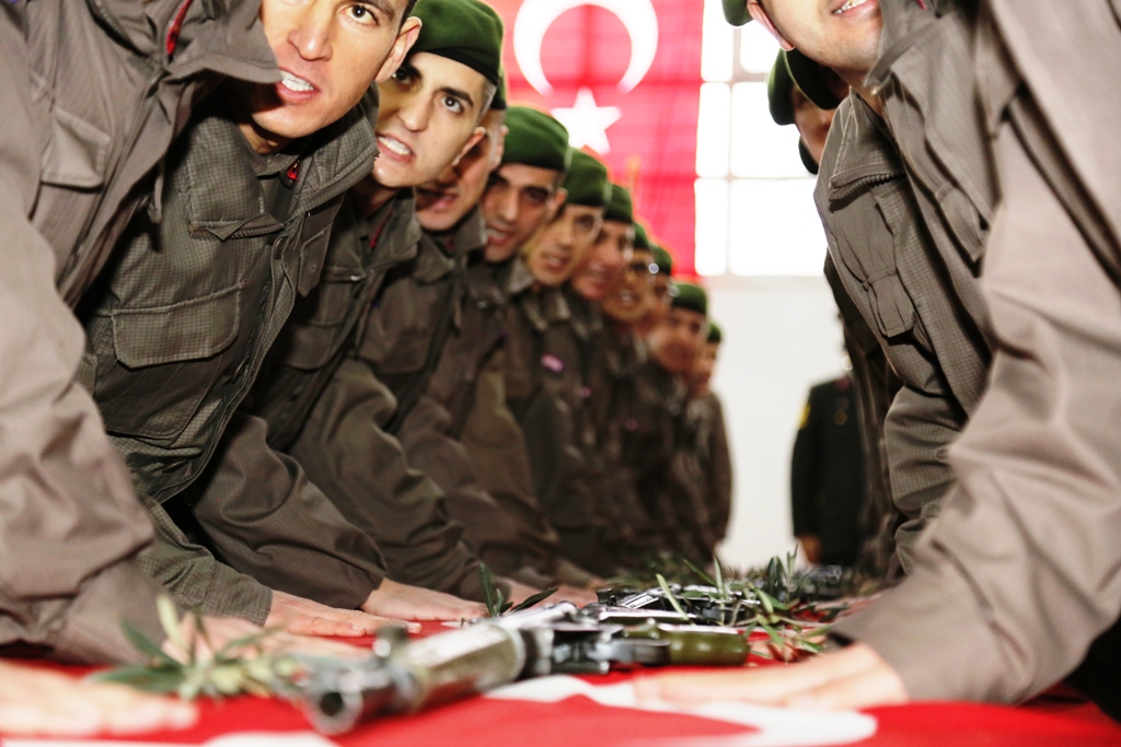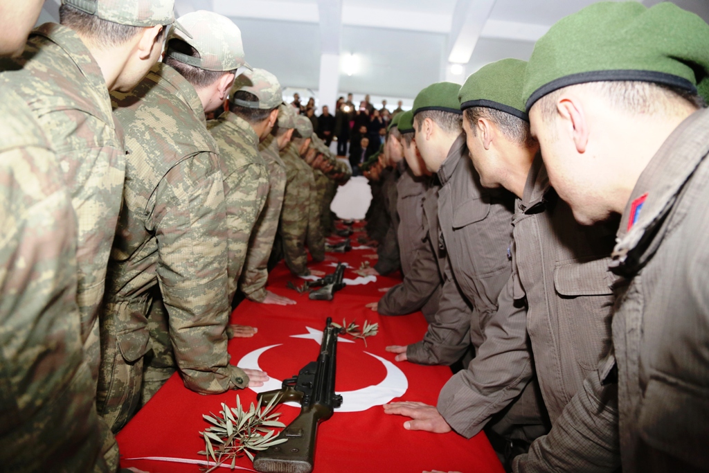 Saygı duruşu ve İstiklal Marşı'nın okunmasıyla başlayan törende, ellerini Türk bayrağı ve silahların bulunduğu masaya koyan 57 asker yemin etti.
