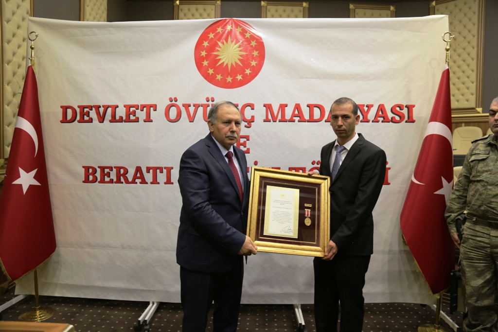 15 Temmuz hain darbe girişimi gecesi Türkiye Büyük Millet Meclisi’nde (TBMM) nöbet tutarken atılan bombalar sonrası önemli ölçüde işitme yetisine kaybederek gazi olan Polis Memuru Yunus Emre Yemiş ve yine 15 Temmuz gazilerinden Polis Memuru İlker Doğan Özcan, devlet övünç madalyası ve beratını Vali Ömer Doğanay’ın elinden aldı.