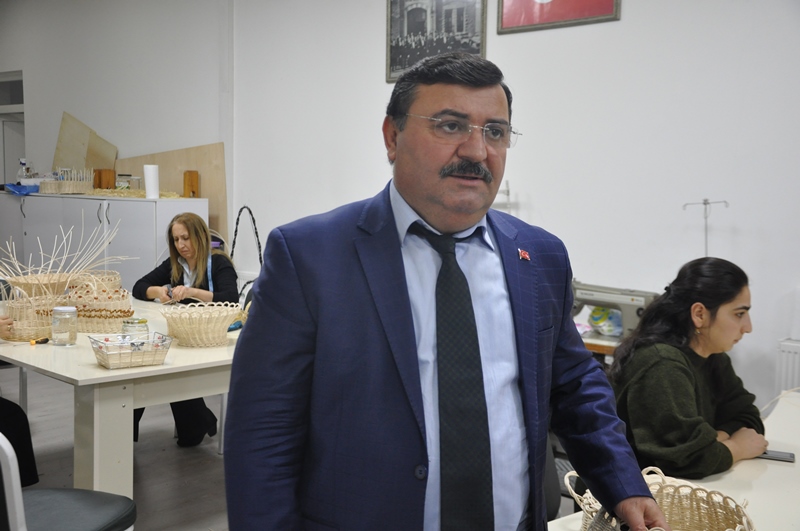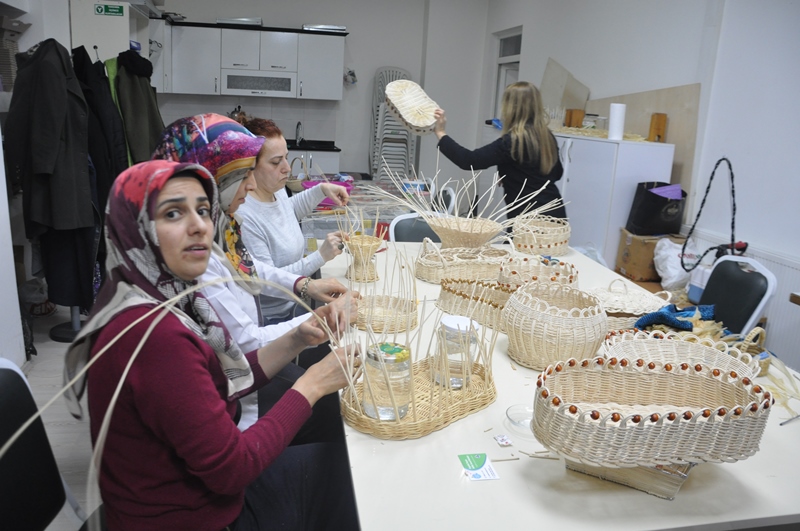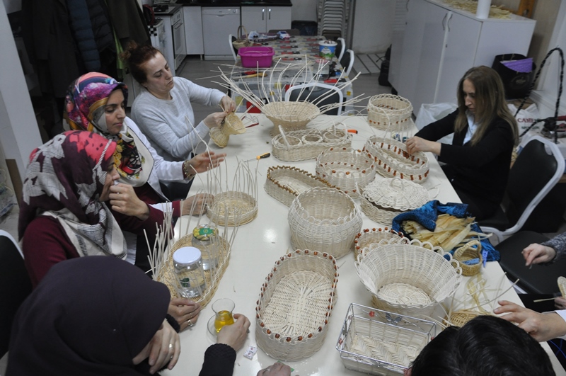 Usta Öğreticisi Perihan Şentürk tarafından verilen ‘sepet örücülüğü’ kursuna katılan kursiyerler bambudan, mısır kapçığından sepet, masa, sandalye gibi değişik ürünler yaparak el becerilerini pekiştiriyor.