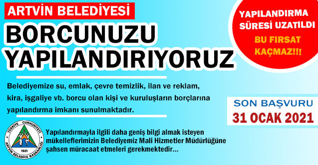 YAPILANDIRMADA SON GÜN 31 OCAK Değerli vatandaşlarımız Belediyemize borcu olan kişi ve kuruluşların vergi, kira ve diğer borçlarını yapılandırma tarihi 31 OCAK Pazar gü
