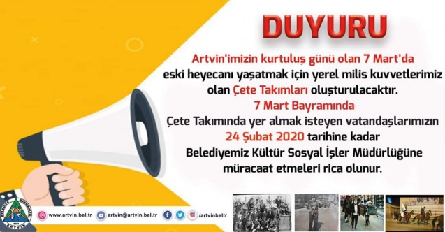 Artvin Belediyesi'nden 7 Mart ÇaÄŸrısı Artvin Belediyesi 7 MART Artvin'in düÅŸman iÅŸgalinden kurtuluÅŸunun yıl dönümünde Artvin'i düÅŸman iÅŸgalinden