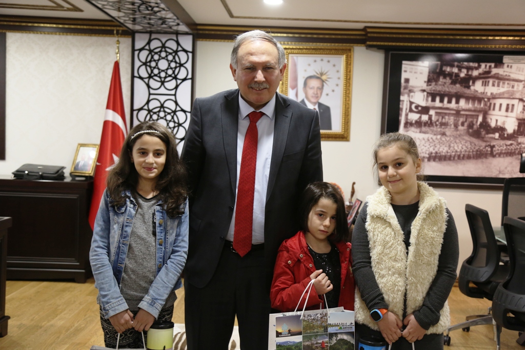 Artvin Valisi Ömer Doğanay, yarıyıl tatiline giren ve ders notları iyi olan bir grup minik öğrenciyi makamında kabul ederek, çeşitli hediyelerle ödüllen