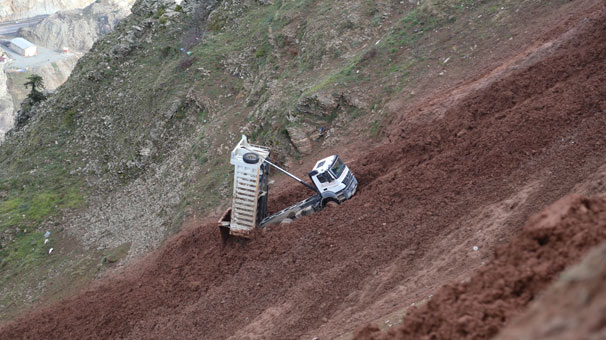 Uçuruma Kayan Hafriyat Kamyonunun Sürücüsü Son Anda Kurtuldu Artvin'de merkez Yenimahalle mevkiinde hafriyat kamyonu yük boşalttığı sırada kayarak 500 metre