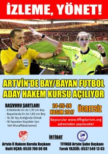 Artvin’de Futbol Aday Hakem Kursu Açılıyor Türkiye futbol Federasyonu Artvin İl Hakem Kurulu tarafından Artvin’de 24-25-26 Kasım 2017 tarihlerinde Futbol Hakem Ku