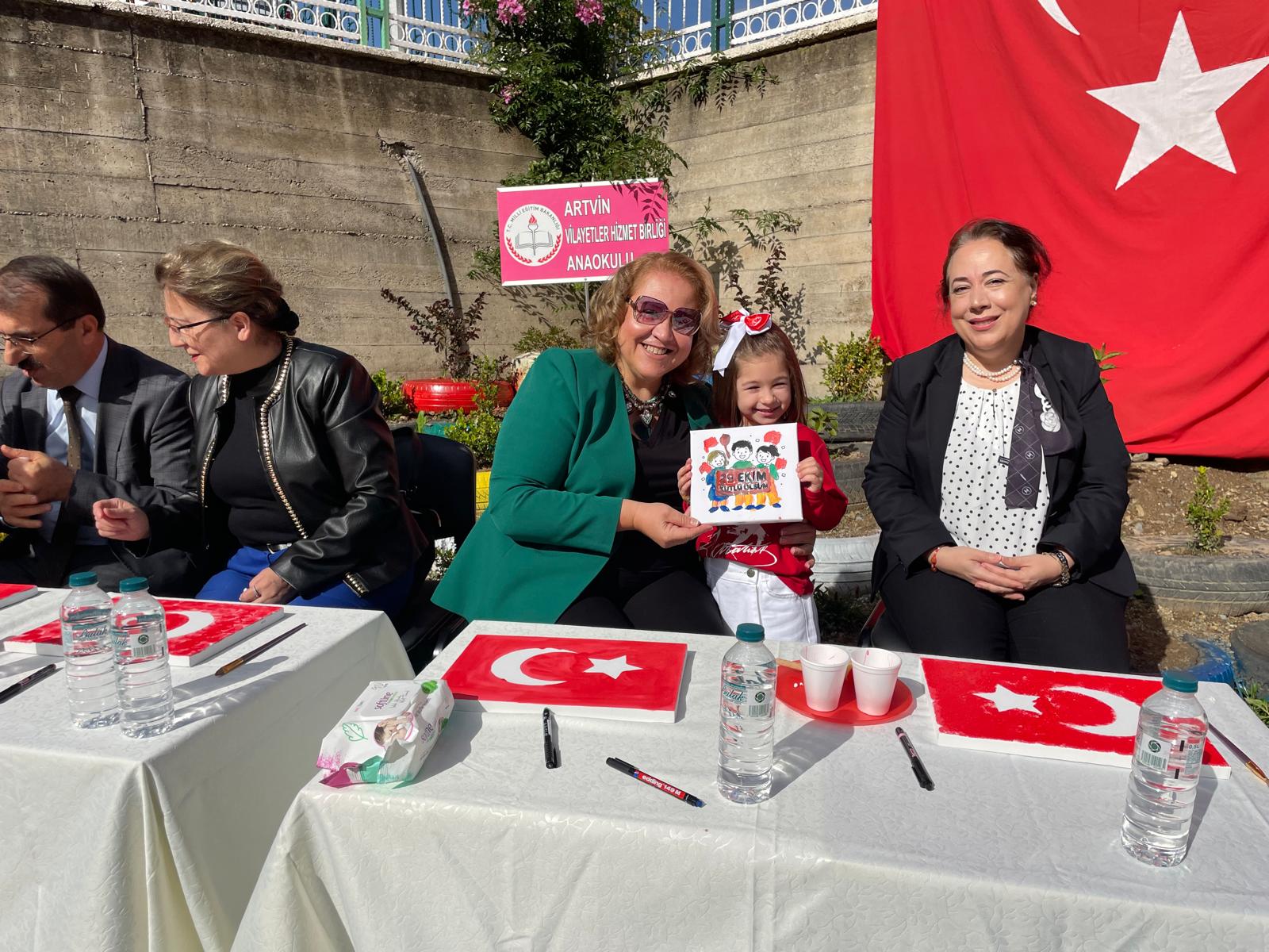 27 Ekim Pazartesi günü saat 12.00’de Vilayetler Hizmet Birliği Anaokulu bahçesinde gerçekleştirilen etkinliğe Artvin Valisi Turan Ergün’ün eşi Hülya Ergün, Artvin Aile ve Sosyal Hizmetler İl Müdürü Nevim Öz, Artvin İl Milli Eğitim Müdürü Fahri Acar, öğretmenler, öğrenciler ve veliler katıldı. Renkli görüntülere sahne olan atölyede, minik öğrenciler aileleriyle birlikte Cumhuriyet Bayramı’nın anlam ve önemini anlatan resimler boyadı. Etkinliğin sonunda öğrencilerin yaptığı resimler bahçede sergilenerek katılımcıların beğenisine sunuldu.