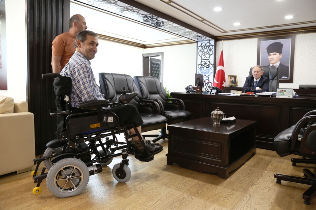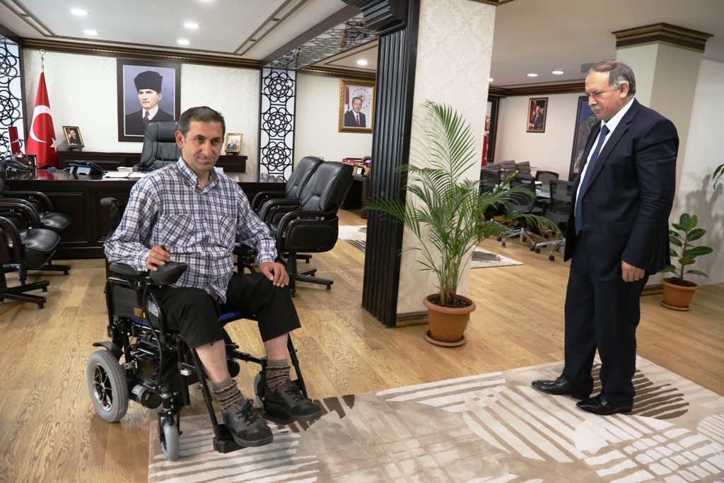 Artvin Valisi Ömer Doğanay, Şavşat ilçesinde yaşayan yürüme engelli Akın Gültekin’i (43), kabul ederek, akülü tekerli sandalye hediye etti.
