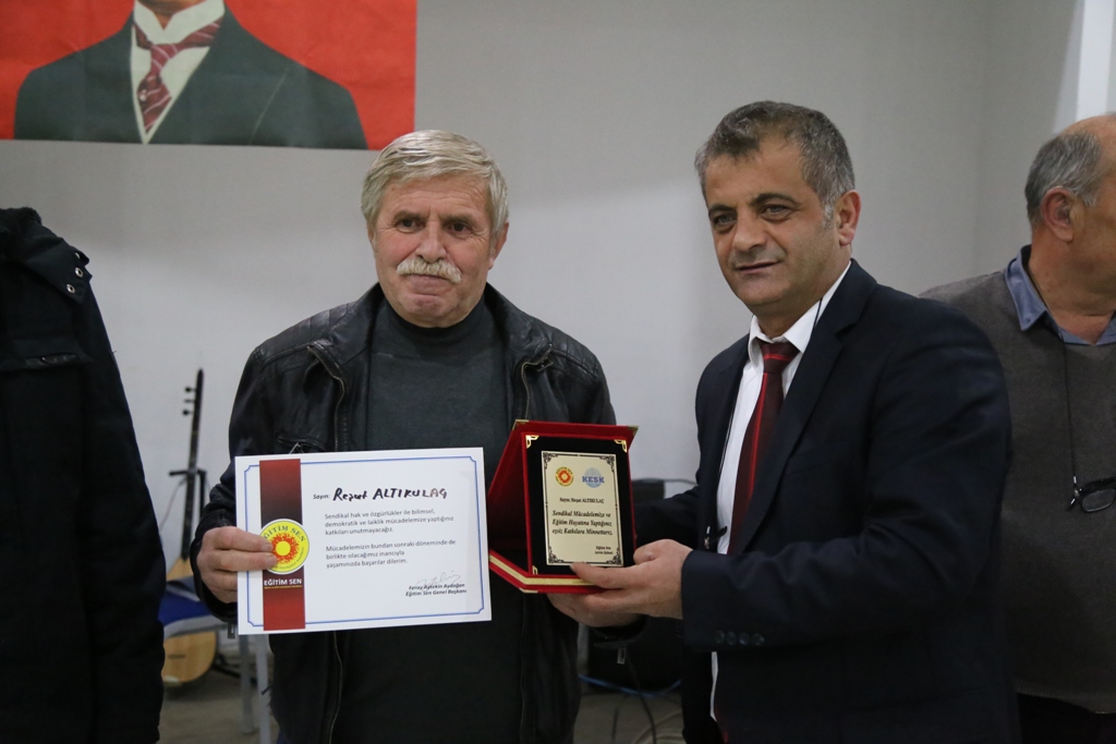 Slaytın ardından emekliye ayrılan Eğitim Sen Eski Başkanı ve 78’liler Derneği Başkanı Seyfettin Altıkulaç, Fen Bilgisi Öğretmeni Reşat Altıkulaç, Beden Öğretmeni Bahattin Altuntaş, Memurlar, Turan Doğan ve Hidayet Akçay Kesim ve Tansel Kaya’ya Eğitime verdikleri emeklerinden dolayı teşekkür belgesi ve plaketi verildi. İl dışında olduğu için geceye katılamayan Emekli Öğretmen Bahattin Altuntaş’ın plaketi ve belgesi daha sonra kendisine takdim edilecek.