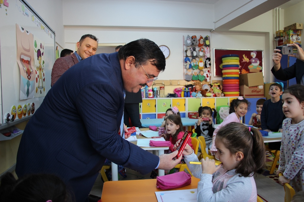 Belediye Başkanı Mehmet Kocatepe, Şehit Ömer Zeki Varan Anaokulunda görev yapan öğretmenlere 24 Kasım Öğretmenler günü anısına hediyelerini takdim ettikten sonra sınıfları gezerek minik öğrencilerle tanışarak çikolata ikram etti.