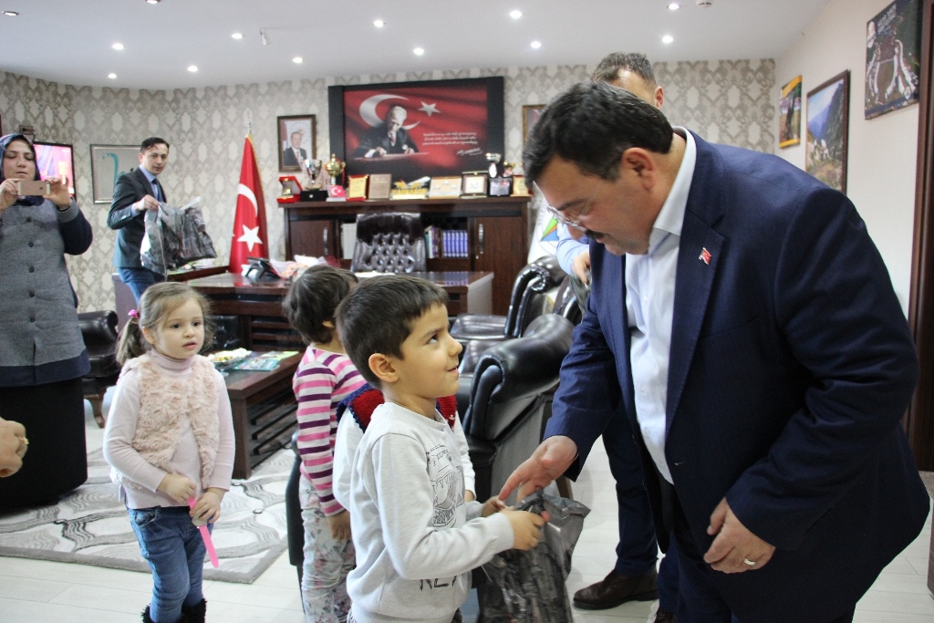 Yıldızlar anasınıfı öğretmeni Sevinç Yatkın Yılmaz eşliğinde gelen minik öğrenciler Belediye Başkanı Mehmet Kocatepe’ye çiçek takdim ederek bir süre sohbet ettiler.