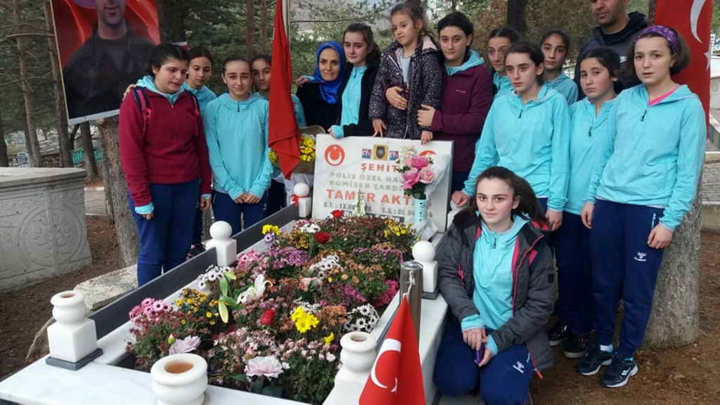 Öte yandan Gazi Ortaokulu Yıldız Kız Hentbol Takımı geçtiğimiz günlerde, Gümüşhane’de yapılan Anadolu Yıldızlar Ligi Hentbol Müsabakalarındaki galibiyetlerinin ardından geçen yıl Diyarbakır’da şehit düşen Özel Harekat Polisi Komiser Yardımcısı Şehit Tamer Aktaş’ın eşi Sosyal Bilgiler Öğretmeni Fatma Aktaş ve kızı Betül Aktaş’ı ziyaret ettiler. Hep birlikte şehidin kabrini ziyaret eden öğrenciler şehidimize dualar ettiler.