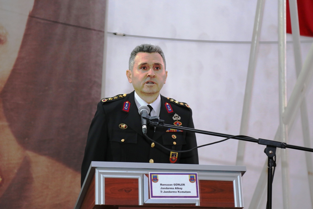 Törende konuşan İl Jandarma Komutanı Albay Gürler, "Milletimizin ve bağımsızlığımızın sembolü olan şanlı bayrağımızın gölgesinde, şehitlerimizin manevi huzurunda, ailelerinizin ve misafirlerimizin şahitliğinde, silah arkadaşlarınızla omuz omuza vererek, namusunuz ve şerefiniz üzerine ant içtiniz. İçtiğiniz bu ant, vatan ve millet sevgisi, vazife, namus ve şeref anlamında olup dürüstlüğün, emirlere mutlak itaatin simgesi bir asker olduğunuzun kabul belgesidir" ifadelerini kullandı.