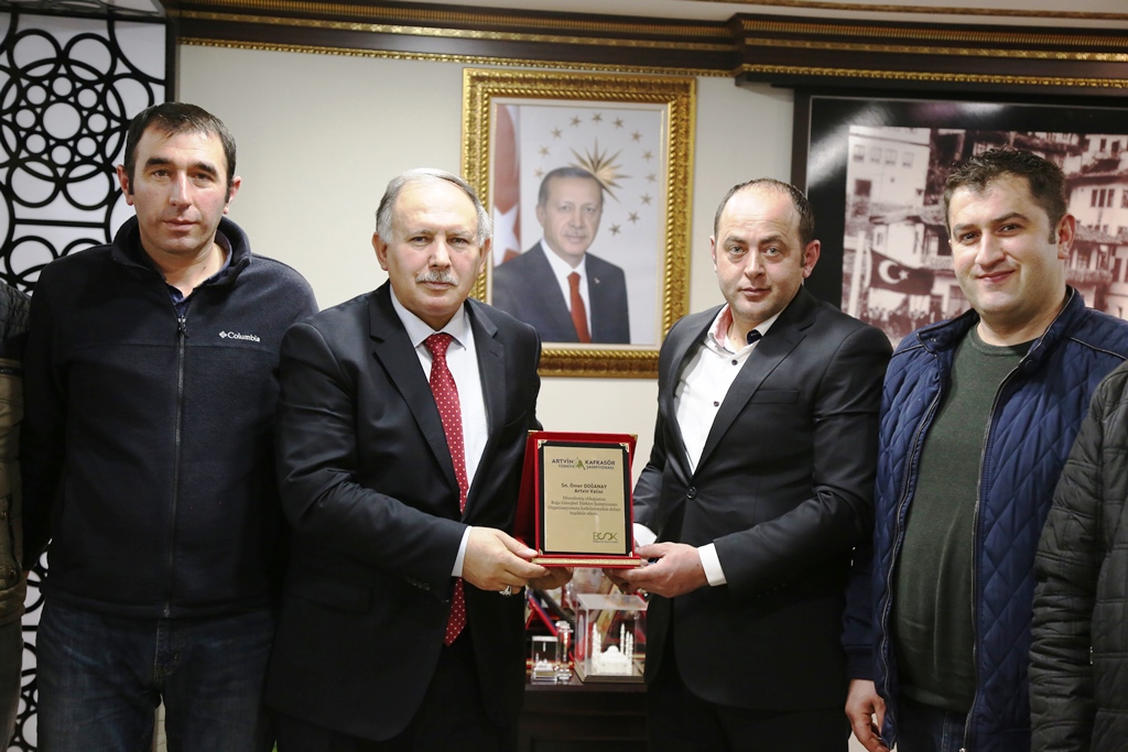 Artvin Boğacılar Spor Kulübü Başkanı Haluk Koçer beraberindeki yönetim kurulu üyeleri Özcan Bayraktar, Serkan Yapar, Ferit Yılmaz, Fikret Beyaz ile Fatih İspirli ile birlikte Vali Doğanay’ı makamında ziyaret ederek, geçen yıl düzenledikleri “Boğa Güreşleri Türkiye Şampiyonası” organizasyonunda kulübe sağladığı katkılardan dolayı teşekkür ederek, plaket takdim etti.