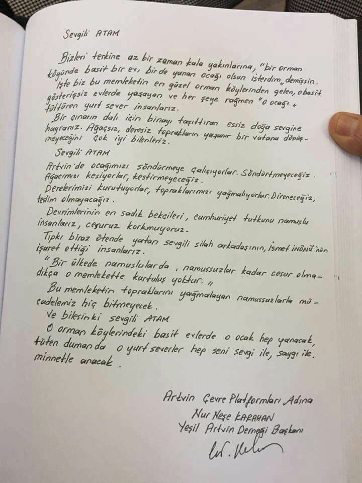Burada Ata’ya saygı duruşunda bulunulduktan sonra Artvin Çevre Platformları adına Yeşil Artvin Derneği Başkanı Nur Neşe Karahan anı defterini imzalayarak, Atatürk’ün doğa sevgisine vurgu yaparak Artvin’de yaşanan çevre sorunları ve doğa katliamıyla ilgili genel bir yazı yazdı.
