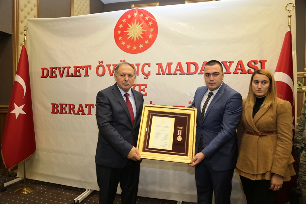 15 Temmuz hain darbe girişimi gecesi Türkiye Büyük Millet Meclisi’nde (TBMM) nöbet tutarken atılan bombalar sonrası önemli ölçüde işitme yetisine kaybederek gazi olan Polis Memuru Yunus Emre Yemiş ve yine 15 Temmuz gazilerinden Polis Memuru İlker Doğan Özcan, devlet övünç madalyası ve beratını Vali Ömer Doğanay’ın elinden aldı.